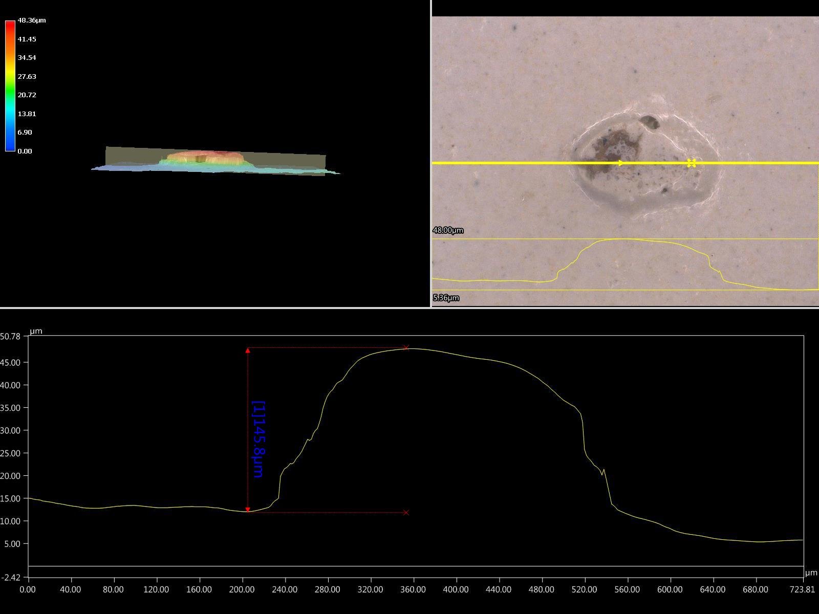 3D function makes it possible to measure at any targeted point. Data can be collected to calculate the profile, height, and volume.