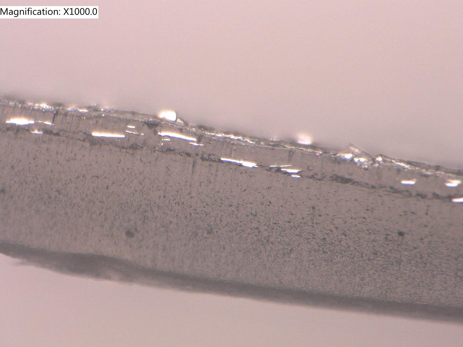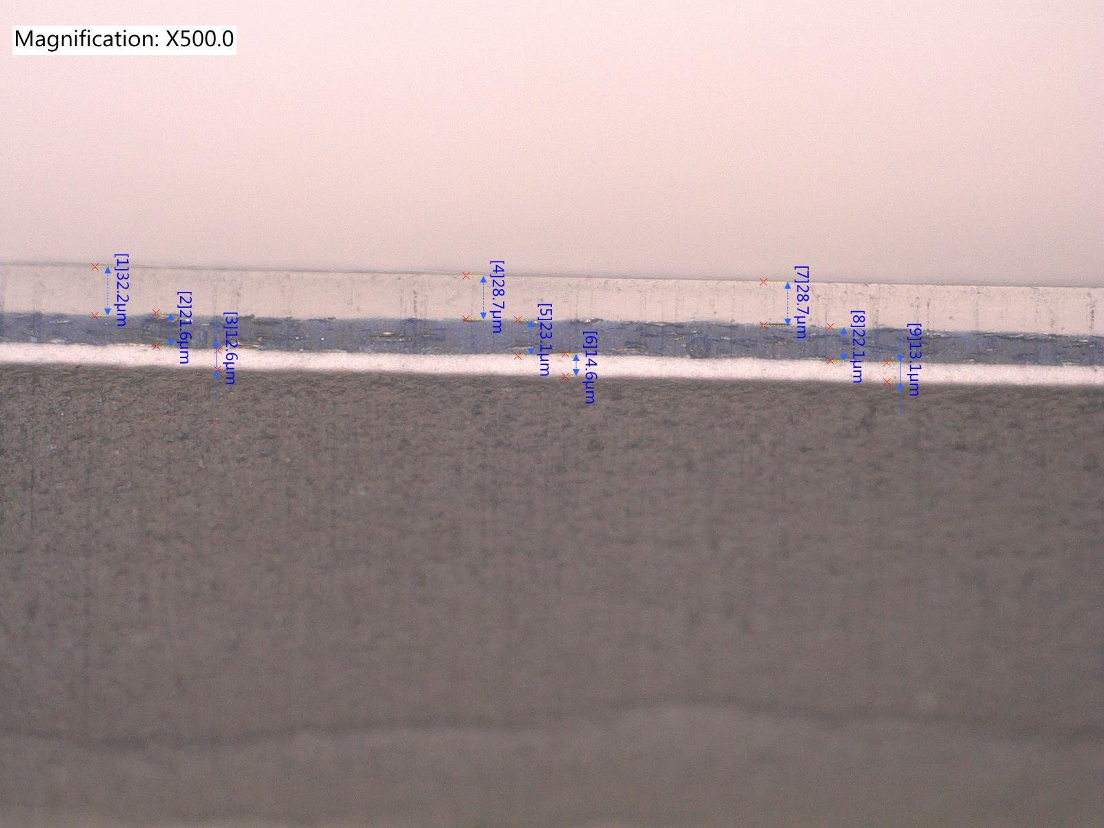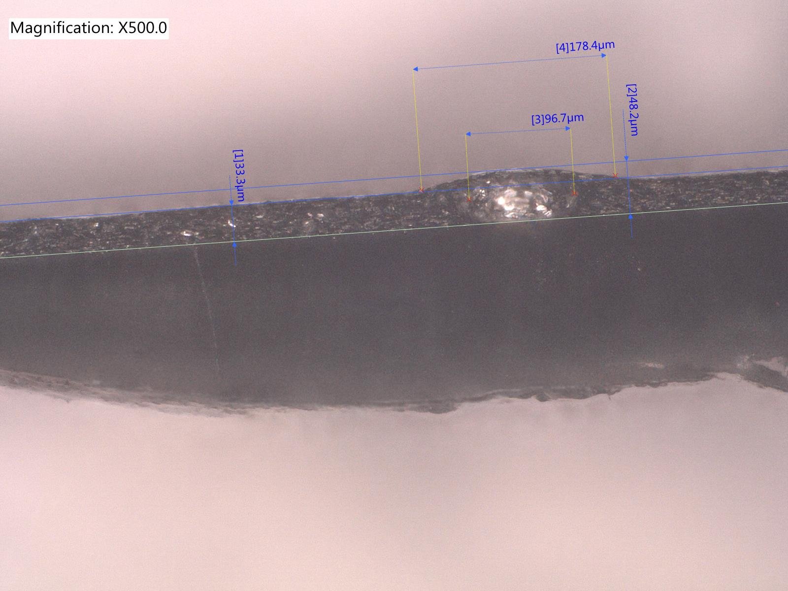The collaboration between the digital microscope and cross section technique can analyze the defect in layer of paint film, check the aluminium flake orientation, measure the dry film thickness of each layers also.
